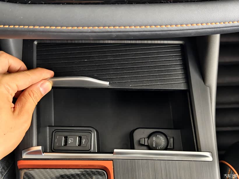 细节方面艾5 GT也是尽可能周到,推开盖板,双U***接口可充电可读取数据,还有点烟器接口,除此之外放置一些杂物也是可以的