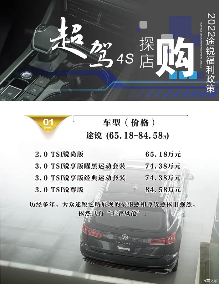 2022款大众途锐新车共推出了4款车型,售价区间为65.18-84.58万元。