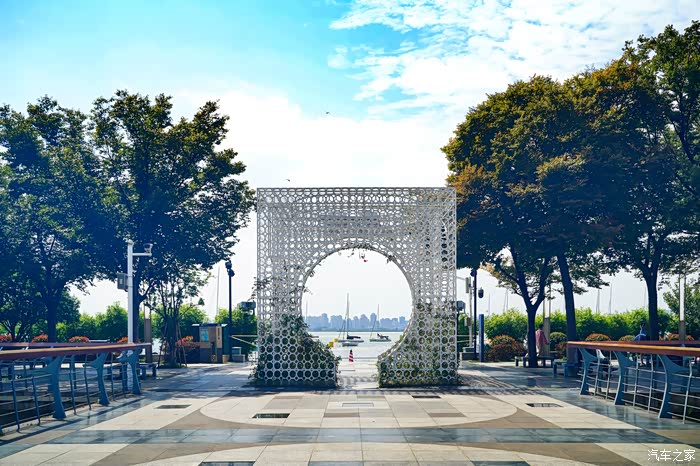 这个镂空网格状的方型圆孔雕塑成为月光码头广场通向金鸡湖的一道门户,下部还种有绿植,穿过这道门就进入了游船码头和浪漫的沿湖景观步道。