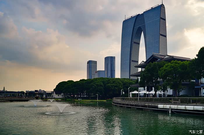 远处的东方之门傲然屹立于众多楼宇之中,似乎在阐述着这座城市的活力,它用绝美的流线迎接东方来风,将苏州特有的细腻与温婉吹拂世界,更以雄厚气势让全球目光汇聚苏州。