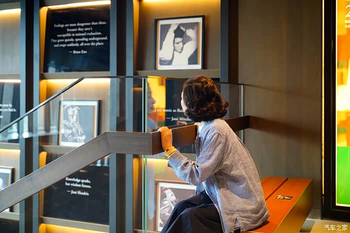 楼梯旁的照片墙陈列了众多老一辈欧美歌唱家照片和他们的格言,媳妇正在专心致志地看着猫王的照片,这里的板凳也是适合看书的地方。