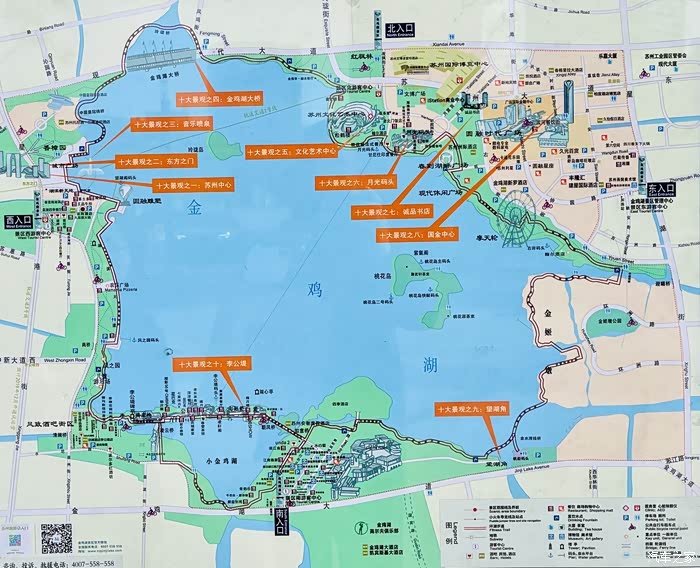但从金鸡湖景区里的游览图看却是10大景观,景观的内容也与网上描述的不一致,不管了,沿湖走就是了。