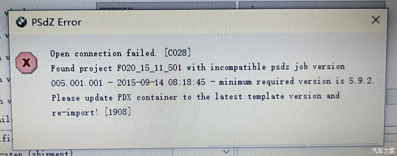 Found project F020_15_11_501 with incompatible psdz job version 005.001.001 - 2025-09-14 08:18:45 - minimum required version is 5.9.2. Please update PDX container to the latest template version and re-import! [1908]