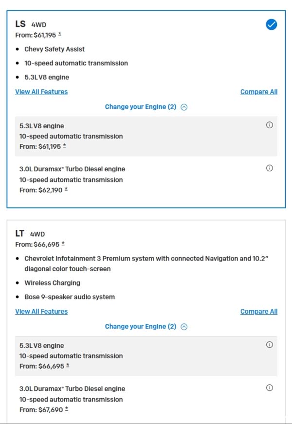 V8是遗憾,但2.7T真的不行吗?我带着怀疑去查阅了资料,并去道朗格试驾了2.7T的太浩,我发现其实2.7T并没有想象中的那么差。之前看了一个介绍太浩美版改版的视频,发现很多网友说美国即使是丐版也是V8,但是在美国雪佛兰官网发现,其实太浩从最低配到最高配全部给出了两个选择,5.3L V8和3.0T两种选择,从数据上来看,一个以大马力为特点,一个以高扭矩为特点。其实国内版本的2.7T L3B是平衡了这两种发动机,更加家用的一个中间选择。