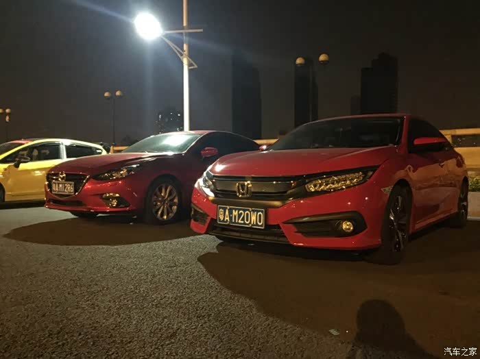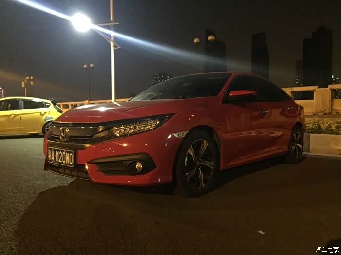 鲜红色在夜晚看感觉比混蛋红要好看 开着自己的小昂一起合照 个人感觉颜值可以说不相上下吧… 这两辆试驾的思域都是不足5000公里的新车。 思域搭配CVT真的无限差评,油门反应缓慢,涡轮介入迟缓。虽然说也可以在内环跑上140,但是对比手动挡的感觉差太远了,没有对比就没有伤害。17寸轮胎的抓地力会好一点但是过弯同样倾侧严重。