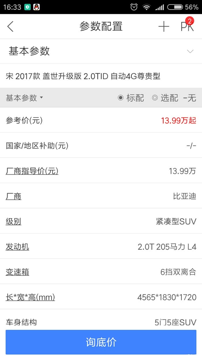 这台车的卖点,就是型号BYD487ZQA的2.0T涡轮增压发动机了。这台机器采用铝合金缸体和缸盖设计,另外凸轮轴采用链条驱动,同时拥有进排气双VVT技术,而在输出动力方面,该发动机输出功率为151kW(205PS)/5500rpm,发动机最大扭矩为320Nm/1750-4500rpm,这个数值比大众途观的EA888 2.0T发动机都要高,后者最大输出功率为147kW(200PS)/5100-6000,最大扭矩为280Nm/1700-5000rpm,和发动机相匹配的是型号为BYD6DT35的6速多片湿式双离合变速器,该双离合变速器换挡速度迅速,多片式离合器能承受大扭矩的输出,而且比自动变速器成本要低。