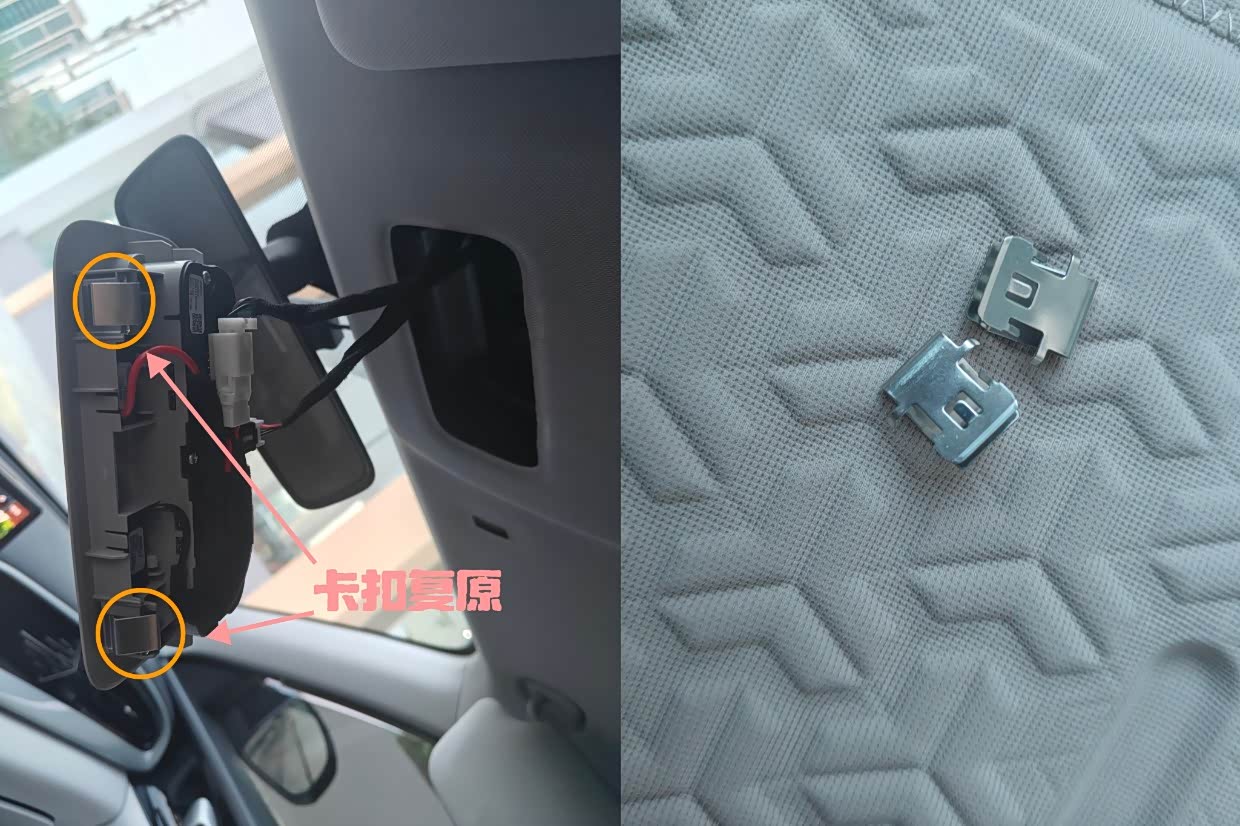 撬开后如图,这两个卡扣会弹飞,可能会谈到车内顶板处,一定要找到,找到后将他插回阅读灯上。