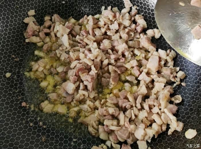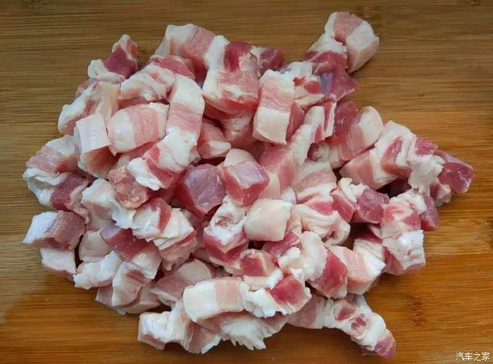 将五花肉切成丁,小一点的丁。