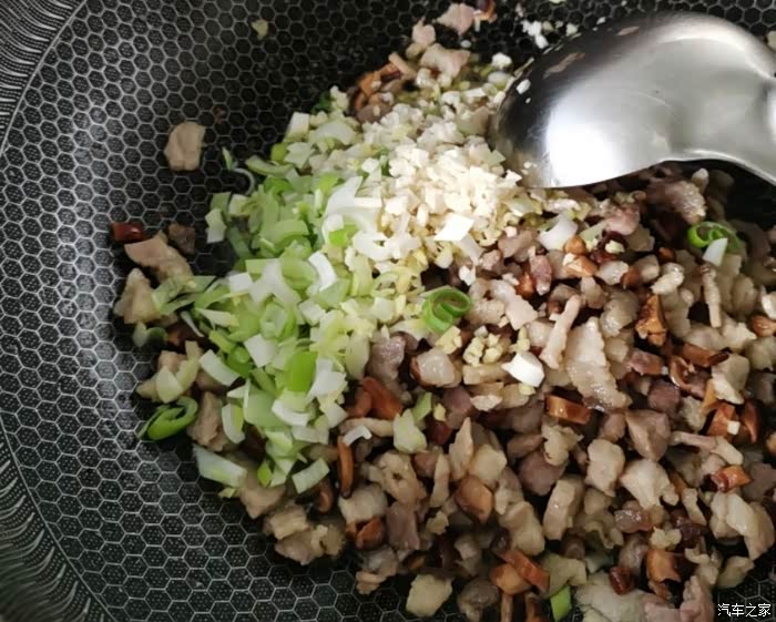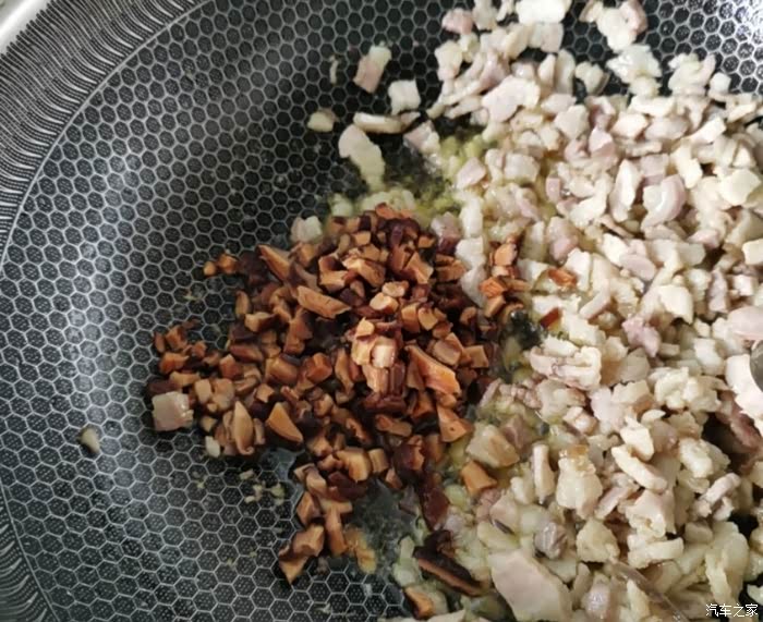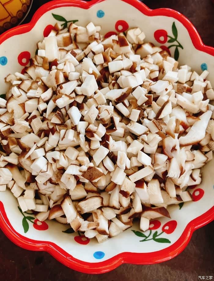 把香菇切成小丁,跟五花肉丁差不多大。