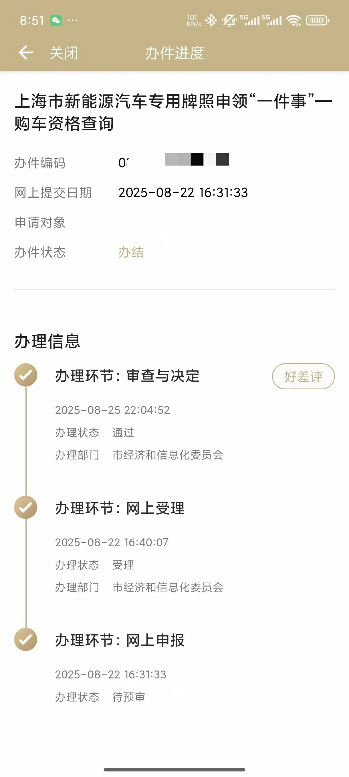 8月25号早上问交付专员,说车子一早已经发出来了;到了晚上,购车资格审核也顺利通过,感觉好运已经开始攒着了。
