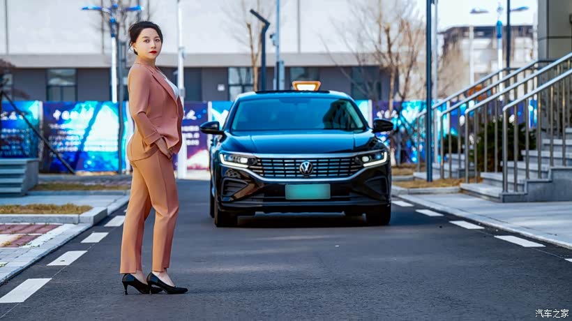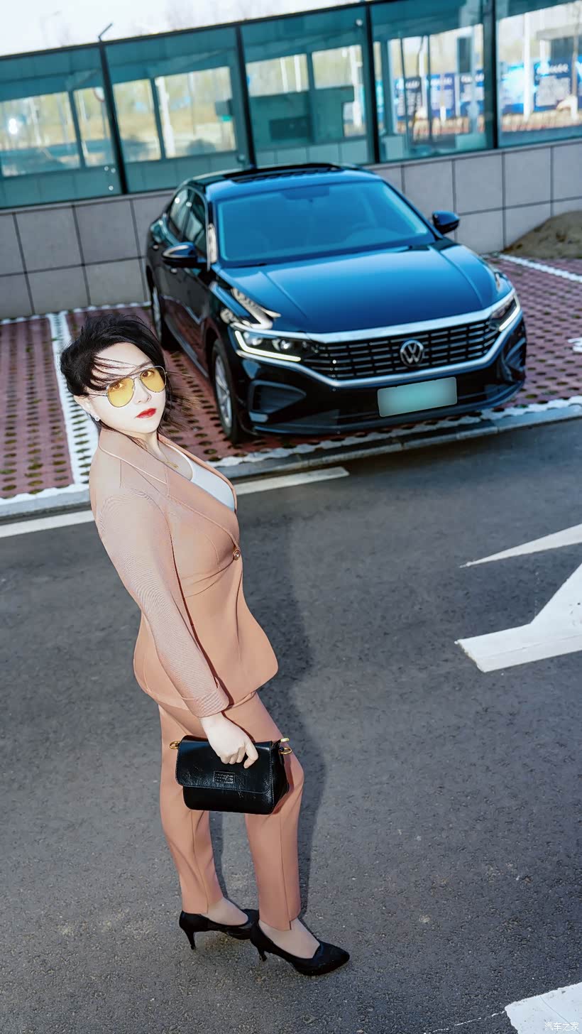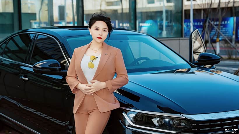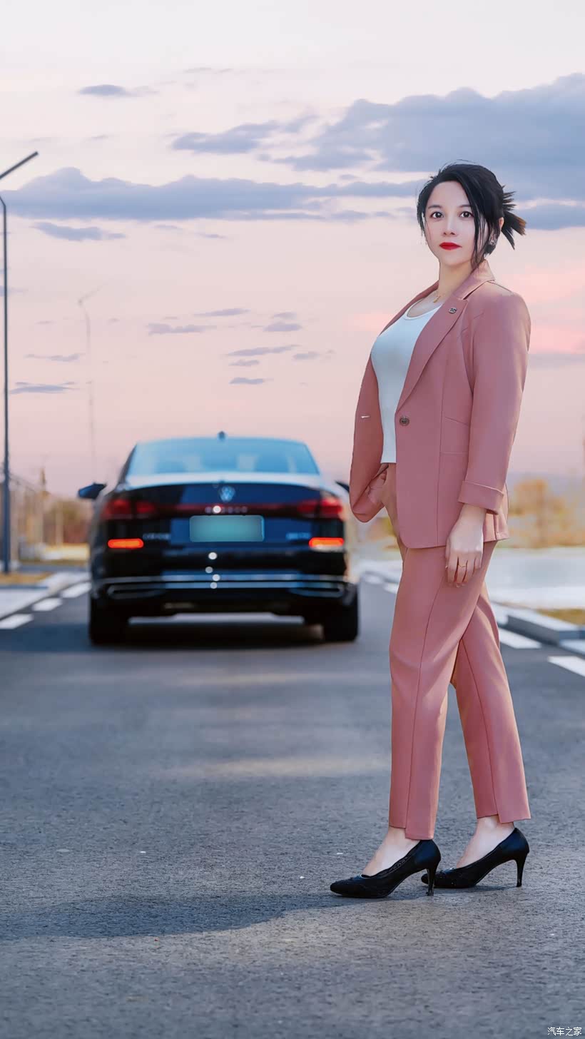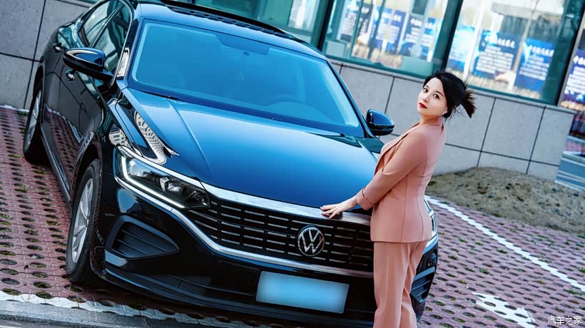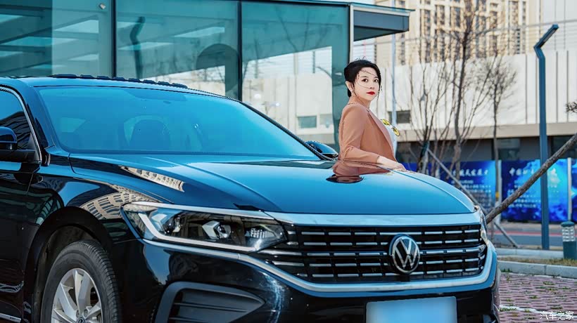 媳妇往帕萨特车头前一站,手扶着引擎盖,微微侧身,帕萨特沉稳大气的外观和媳妇干练优雅的气质完美融合