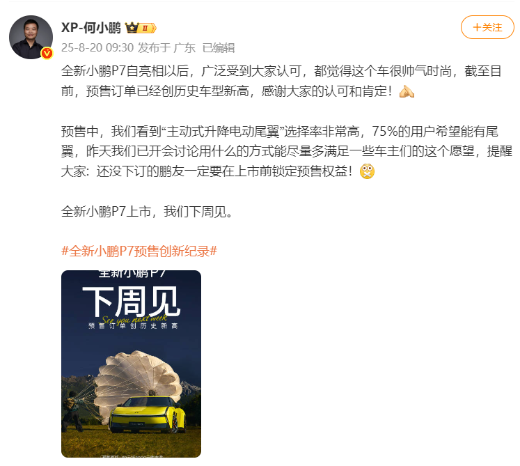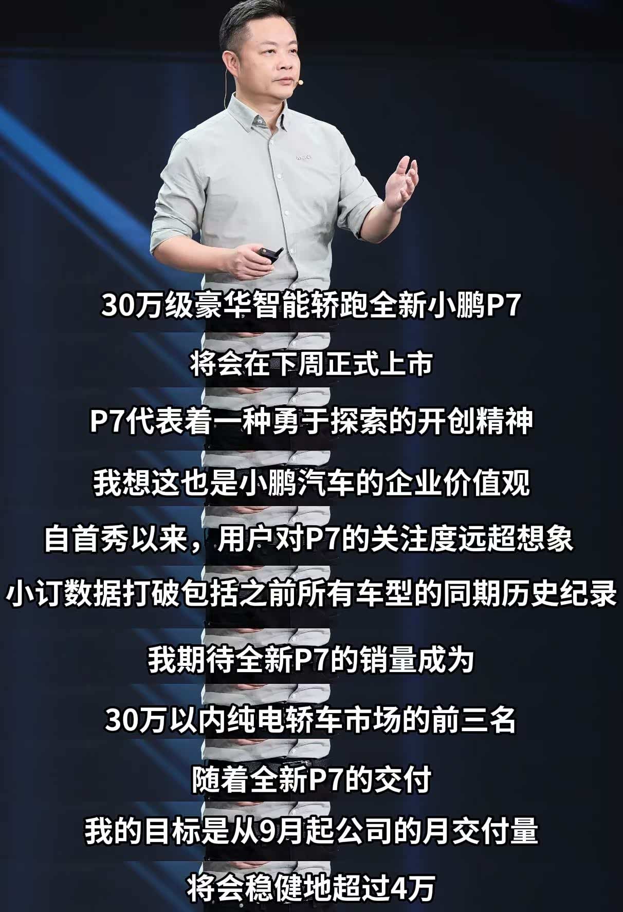 何小鹏希望新车成为30万元以内纯电轿车市场的前三名,目标是随着新P7的交付,整体从9月起每月交付量超过4万台。这个目标不小,意味着他们对自己的产品力很有信心。