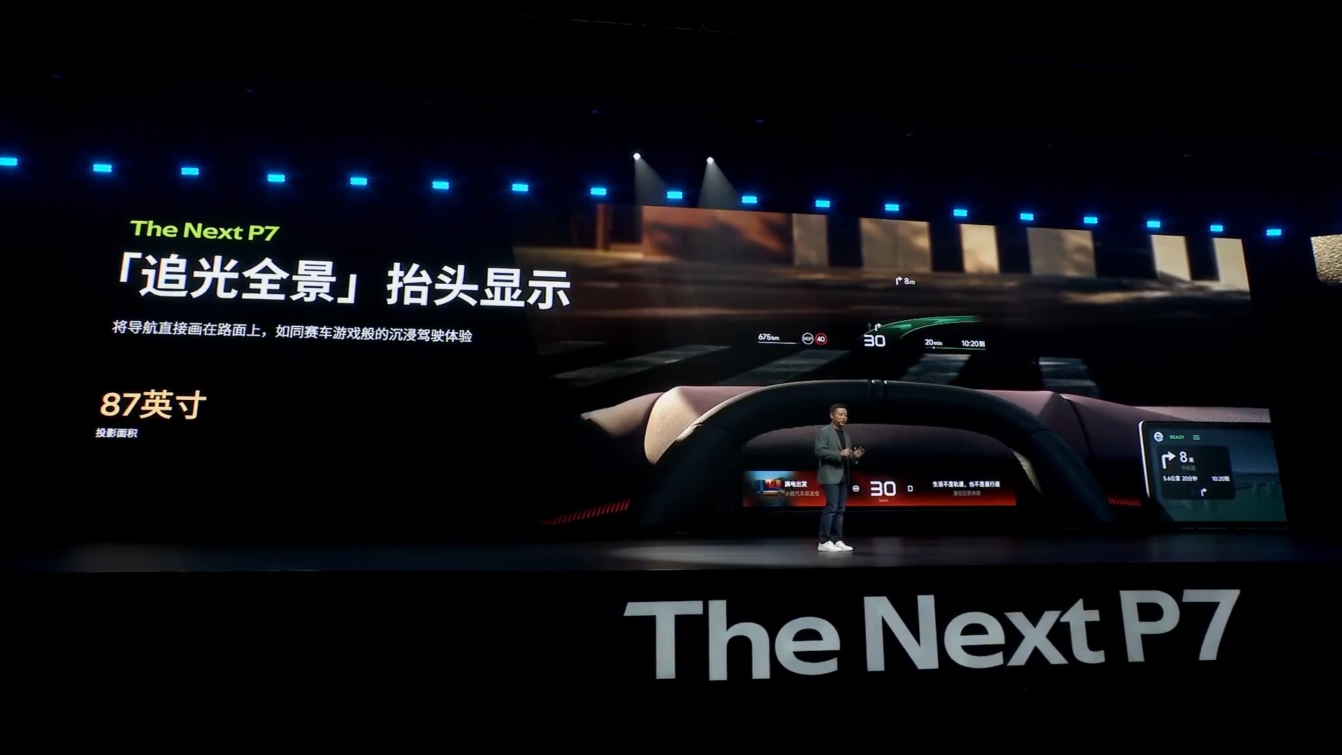还有个小细节,新P7全系标配了87英寸追光全景HUD,这玩意在别的车上通常只有高配才有或者需要选装。