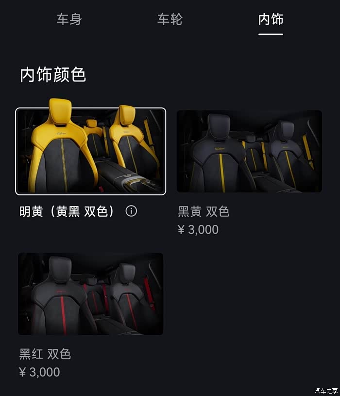 内饰颜色明黄(黄黑双色)是标配,黑黄双色和黑红双色需要加3000块选装。而且,它还免费送15件碳纤维部件,从外饰到内饰,高级感和运动感直接拉满!