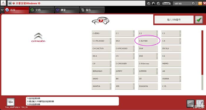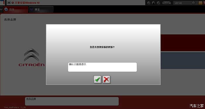 2、进入软件,选择不更新,然后选择车型,爱丽舍,连接诊断线,通电车辆。此时开始匹配车型——此时车辆会让你确认车架号,确认即可。