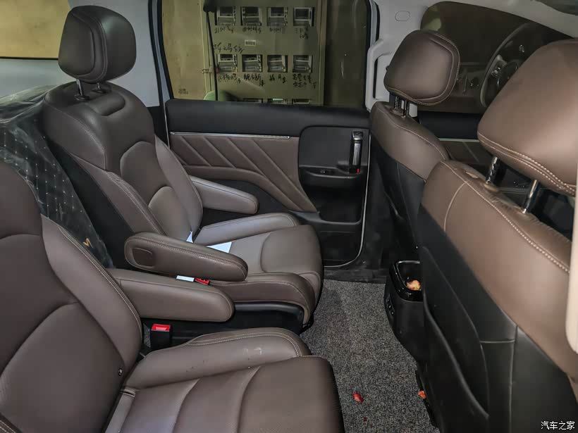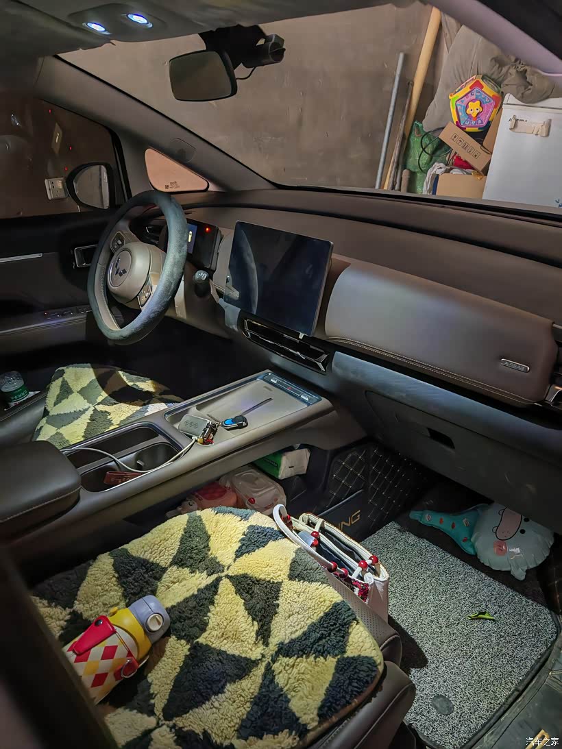 内饰是浅棕加黑色,当时销售说容易脏,我还担心来着,结果用下来发现还好。小孩吃东西掉的饼干渣、牛奶渍,拿湿布一擦就掉。中控屏幕不算大但操作简单,连蓝牙、开空调这些基本功能,我爸妈看两遍也会用了。最满意的是前排中间那个储物槽,能放我儿子的奶瓶、湿纸巾,还有我的保温杯,随手就能拿到。