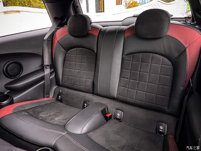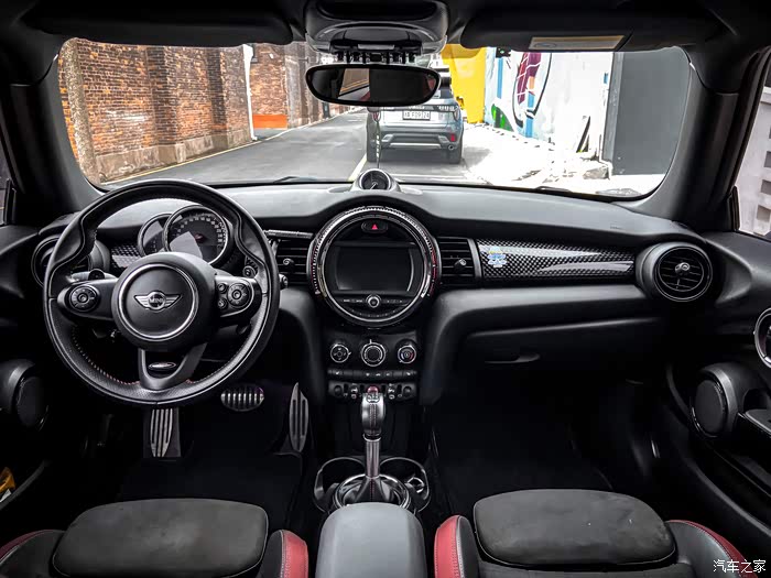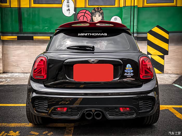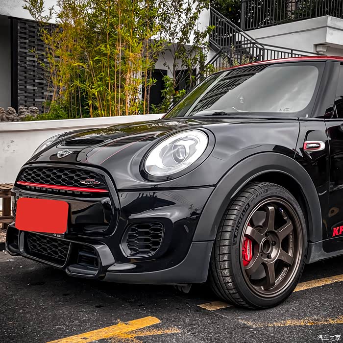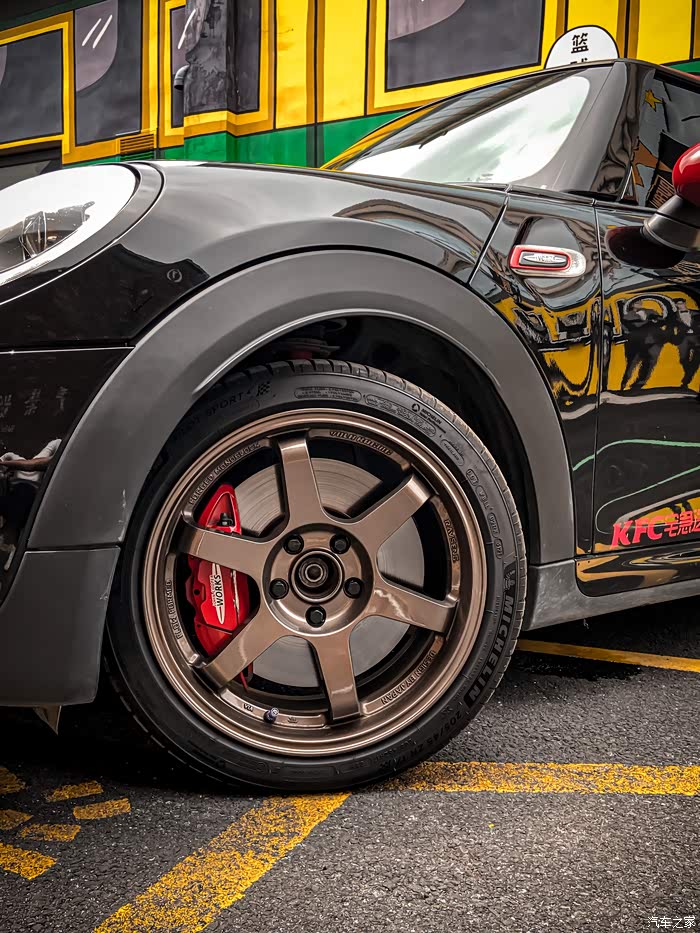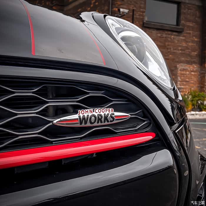 来张俊俏侧颜,这个角度是我最喜欢的。相比其它基础款的MINI,JCW从外观上就能感受得到它的肌肉感。虽然身段依然娇小玲珑,但内心绝对是科不折不扣的勇猛硬汉,全身的线条很扎实,远远一看就有种全身附着着紧实肌肉的既视感。所以如果你是第一次见到JCW,千万不要被它圆圆的大灯“萌混过去”,以为他是个弱不禁风的小白脸,实际上是个拳拳到肉的“李小龙”。原厂自带的brembo红色卡钳加上熏黑轮毂,不愧是官配,整个就是一套“美强酷”的组合拳,而且刹车效果直线上升。车尾中间带双气筒,光是看着就已经想踩油门驾驭一下了。