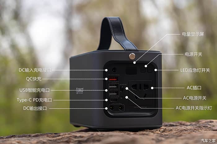 在储能电源上方也设有提手设计,提手为皮革材质,长时间携带也不会给皮肤带来压力。