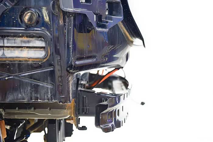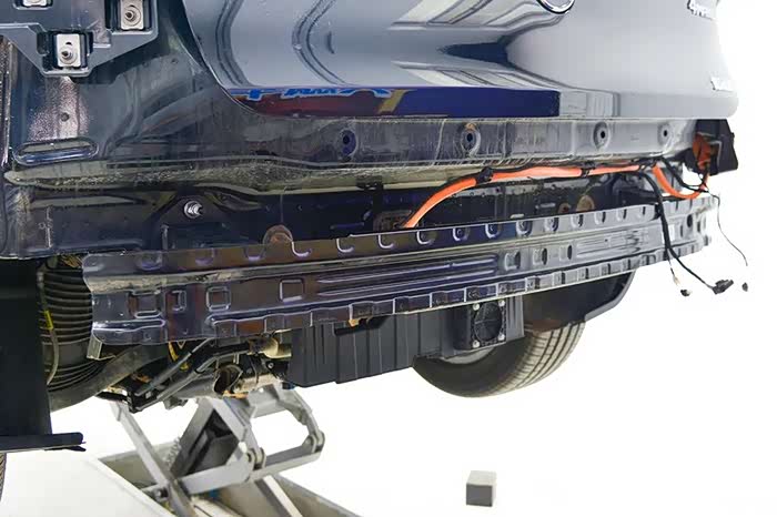 后吸能盒是钢板焊接而成,带有溃缩褶皱和打孔,固定螺栓没有缺失。