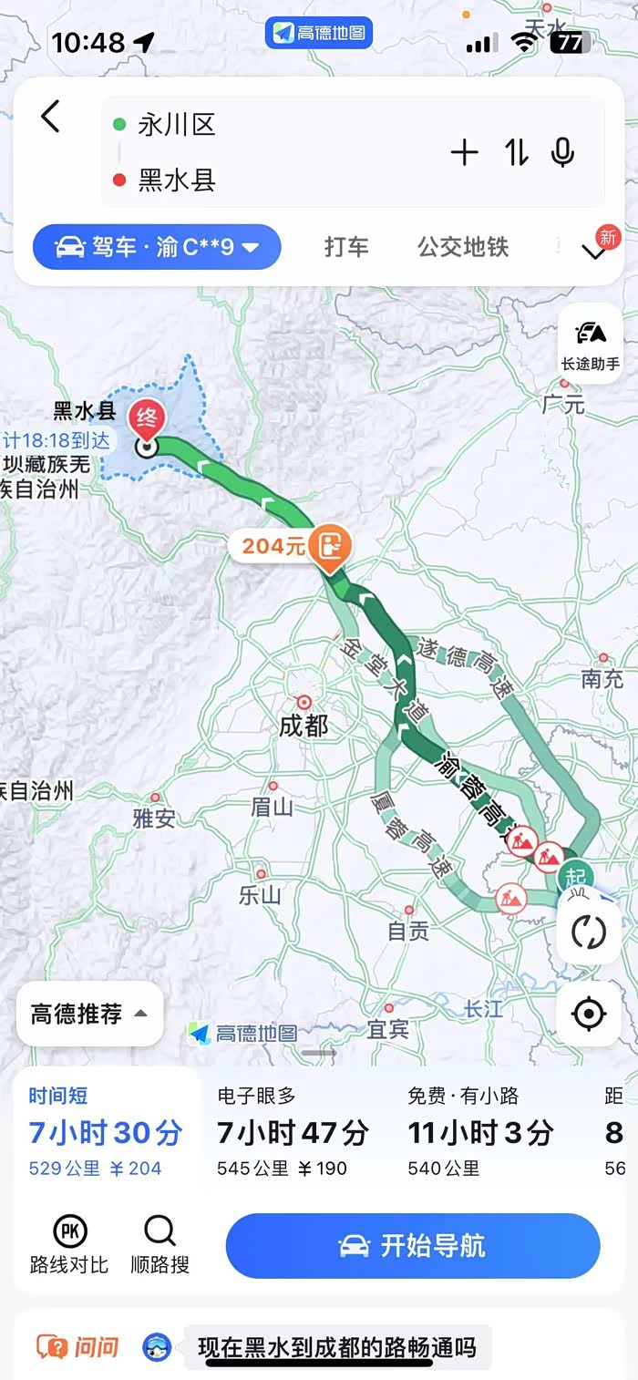 高德地图提供多条线路选择,1是走都汶高速过理县到黑水县,2是走绵汶公路,川汶公路到黑水,由于路线1开不同车跑过多次了,毫无新鲜感,选择了从没跑过的路线2,结果路线2太难跑了,一路都是限速40的隧道,跑着挺折磨人的,照片都没怎么拍。