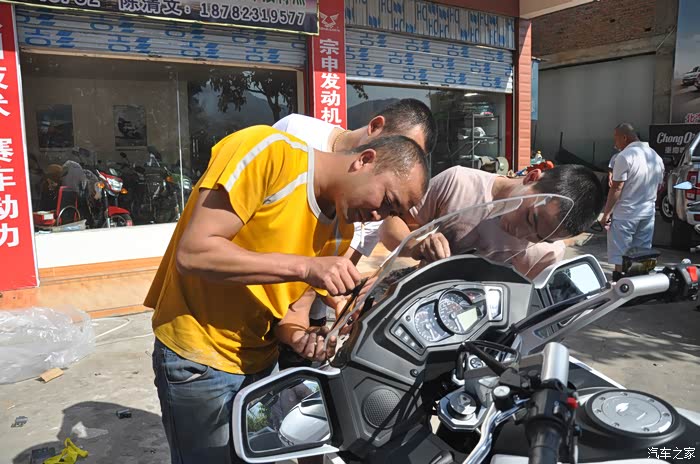 车一抬下来,大家就忙着给我装车,风挡、保险杠、辅车灯等等,从中午3点提车,到下午6点半才安装完成。有些照片是单反照的,稍微清楚一些,有些是手机照的,见谅,本人照相技术确实不咋地。