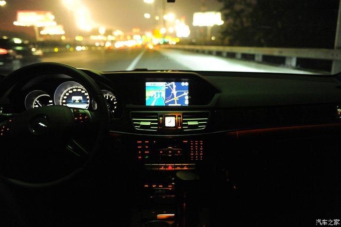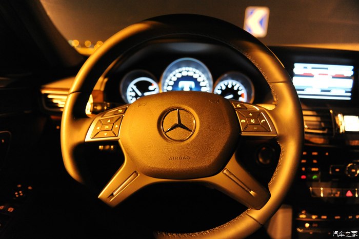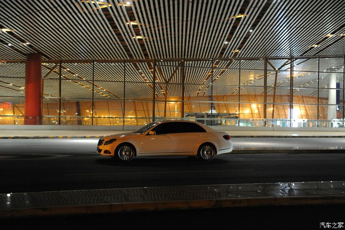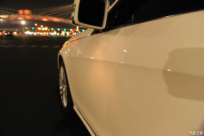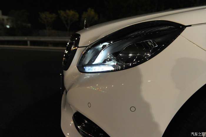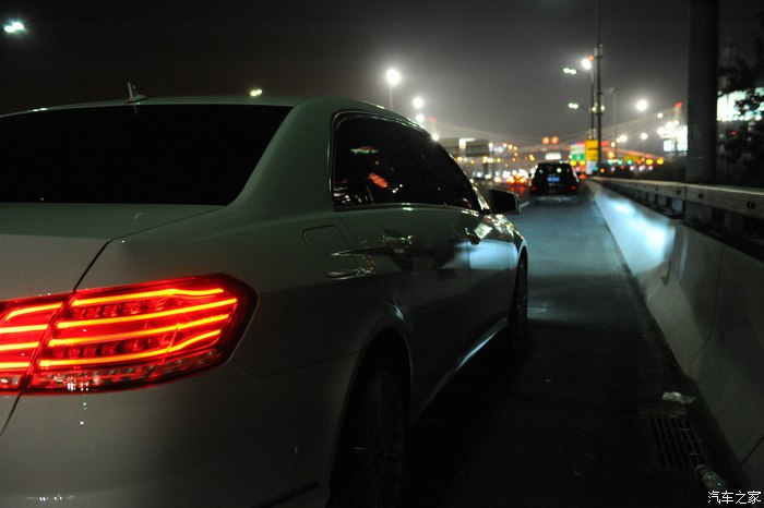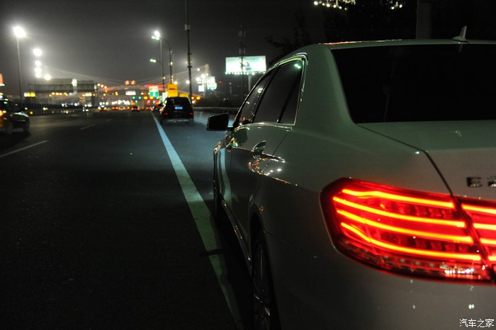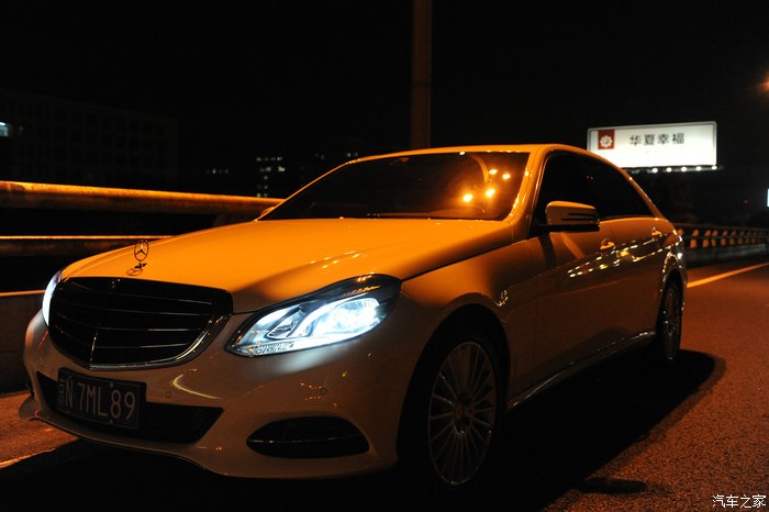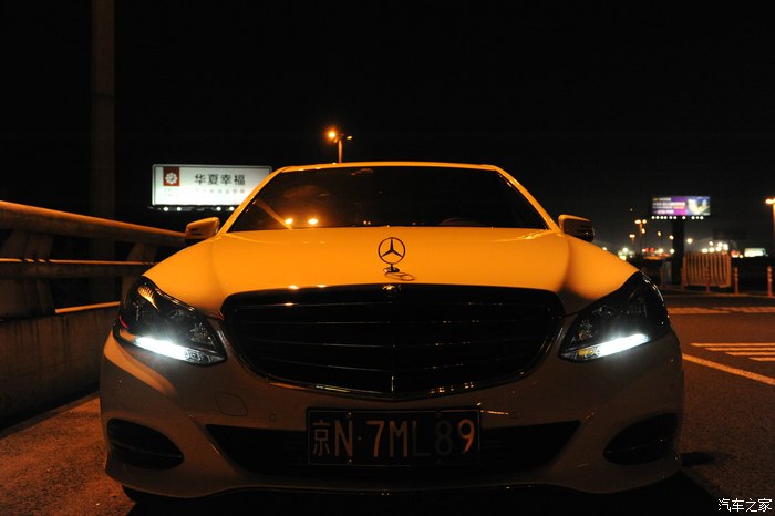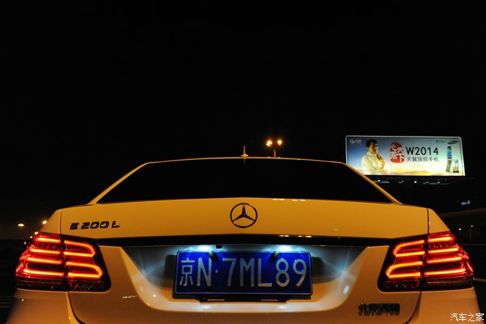 【灯光洒在奔驰车上显露出金黄色,冰冷的车牌灯更是点睛之笔】