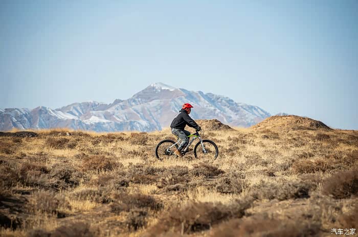 从车顶卸下自行车,戴好护具,沿着沙漠中间一条崎岖的公路骑行。