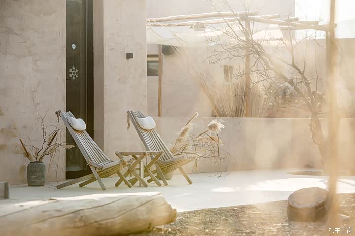 大概没有人会不爱这样的环境,可以生火的庭院,可以眺望见长城的宽大露台,阳光下的木制躺椅,还有墙上斑驳的光影。