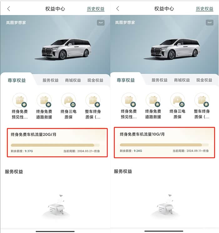 首先,我发现APP上显示的20G免费车机流量实际只有10G可用,而且汽车激活时间也被擅自调整,而且汽车激活时间也被擅自调整,从2024年3月21日变成了2024年9月11日。更令人气愤的是,在仔细核对认购权益书后,我发现原本约定的免费充电桩和免费终身基础保养两项重要权益竟然不翼而飞。