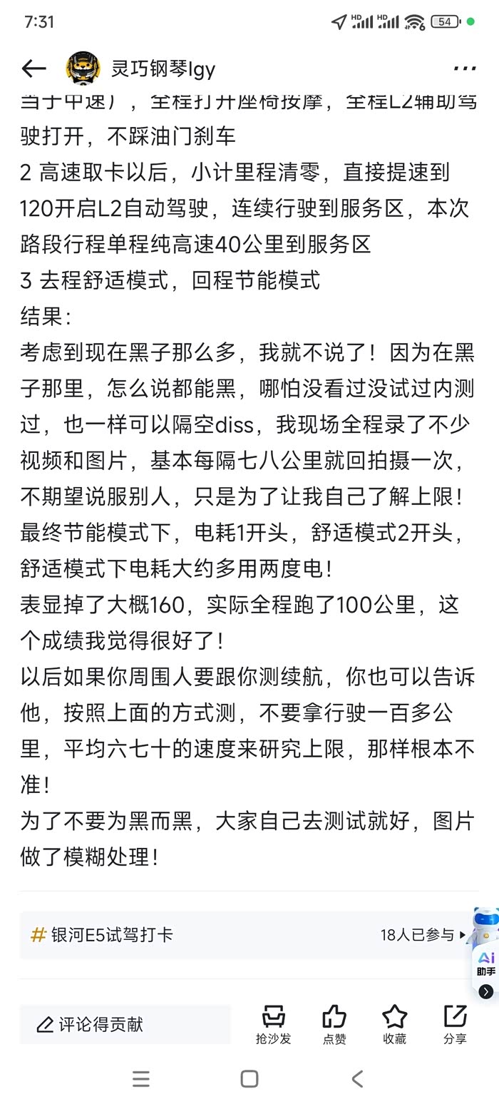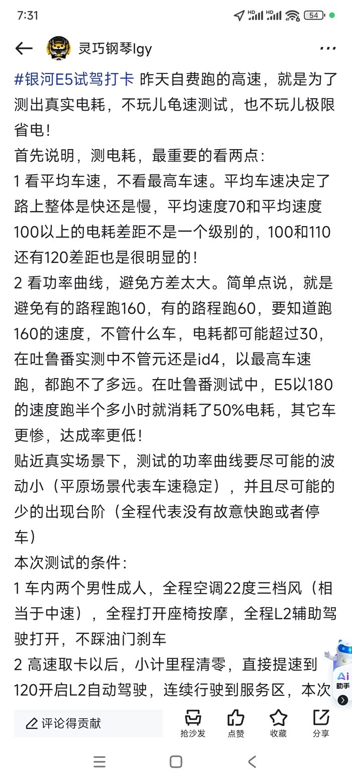 应该算是全网首测了!昨天实打实的测了120平均速度的吉利银河E5,节电模式下百公里电耗不到20个,这已经很好了。