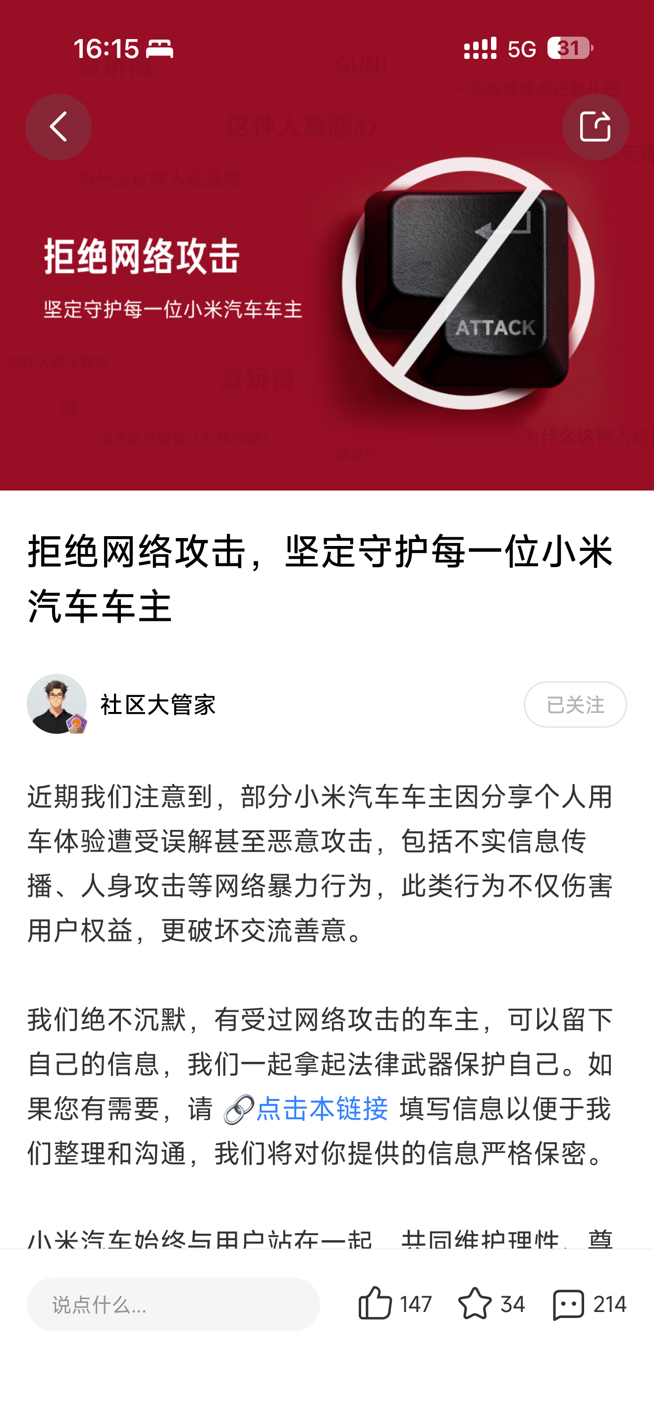 今天忽然看到小米社区要帮车主维权,想起来前几天有个车友起诉网络暴力成功的事儿,我立刻想响应!我愿提供聊天记录、截图等证据,也盼平台严惩网暴账号。只有肃清网络暴力,每个热爱生活的人,才敢畅快分享呀~