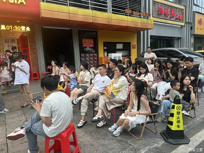 排队奇景:下午五点,店门口的塑料凳已坐满“等位特种兵”,外卖小哥的电动车也排成一排。