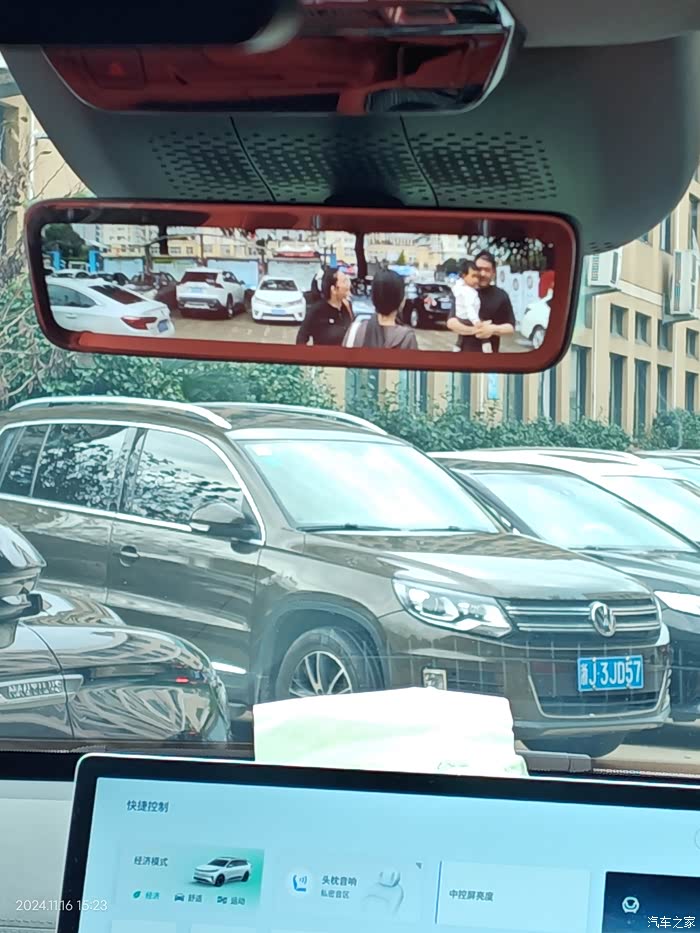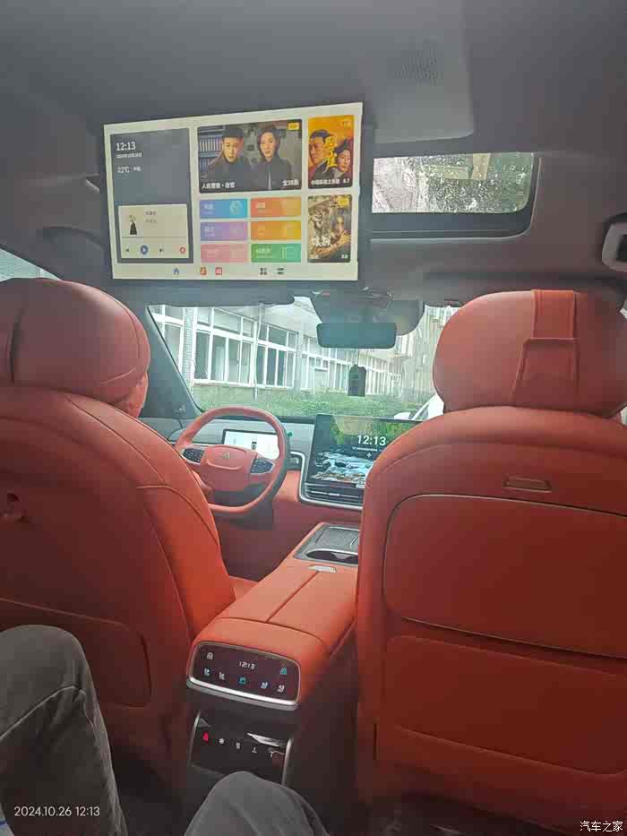 还有高大上的车内流媒体后视镜,二排娱乐屏放下来,也不会被挡住,车后面即使光线暗,也可以看到清楚的后车,晚上还有自动防眩光。不像零跑C16要在中控屏上显示流媒体后视镜。