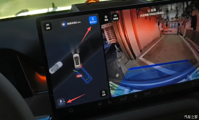 进入小区后,中控屏上出现了“发现停车位”的提示,出现了蓝色的园区内导航路线(AVP代客泊车功能开启),轻按智驾导航按钮,车辆直奔车库而去,倒车时不但识别了车库的墙壁,还识别了地上的标志线和限位器,两上两退,干净利落地把车停到了车库里,而且还支持“离线泊车和“左中右””的停车位置供车主选择,我选择了靠右,便于使用慢充桩充电。为了防止反光镜与门框相撞,尚界H5自动折叠了反光镜,安全措施很到位。