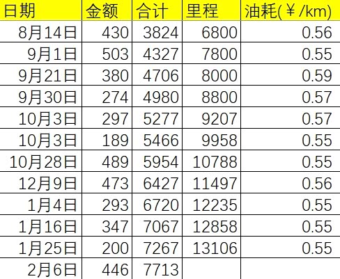 首先是油耗,每次加油手工记录金额,然后查看总里程填写到表格,使用准备加油之前的总支出除以总里程,得出平均每公里的油耗费用。