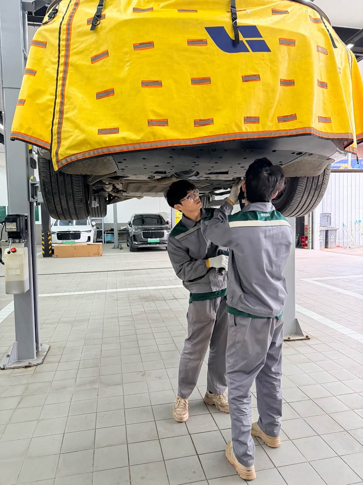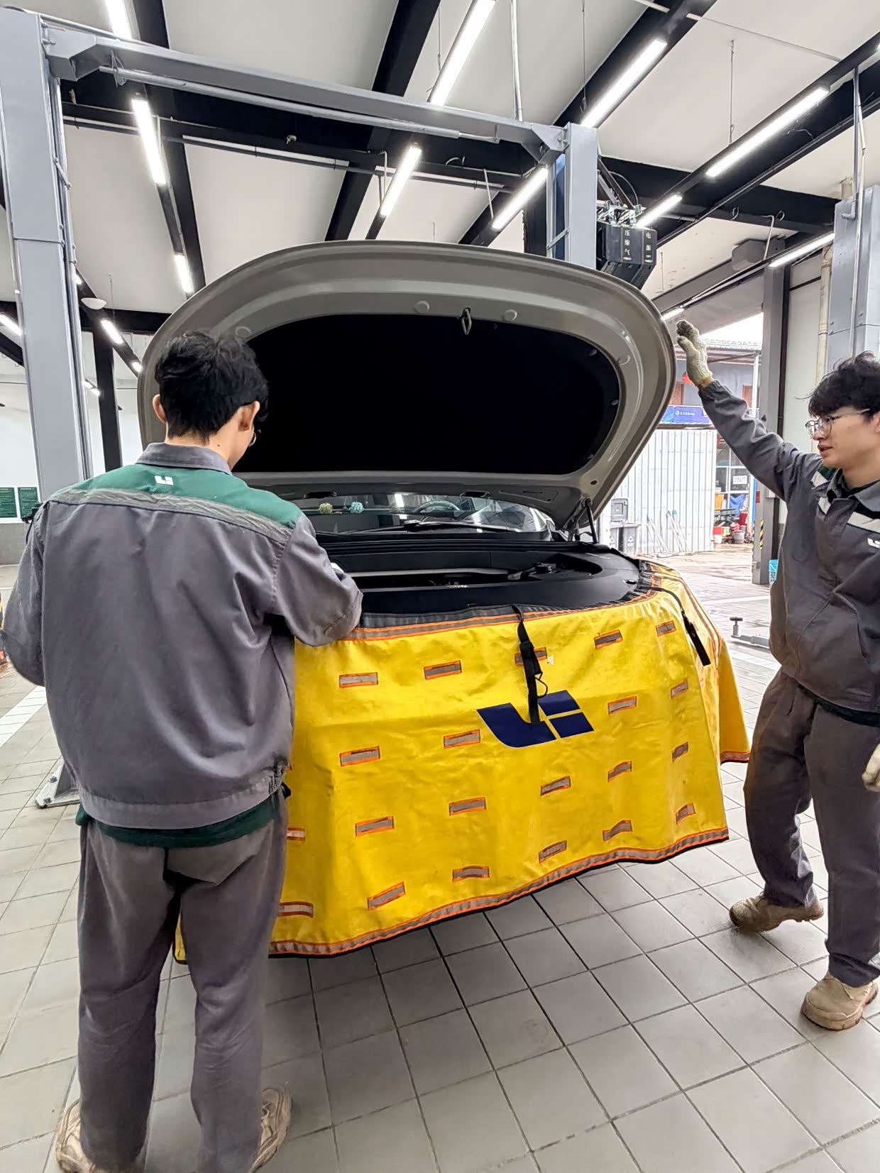 2. 车辆进入工位:售后人员会在座椅上套上防护袋,然后由售后人员将车辆开进维保车间的工位上。