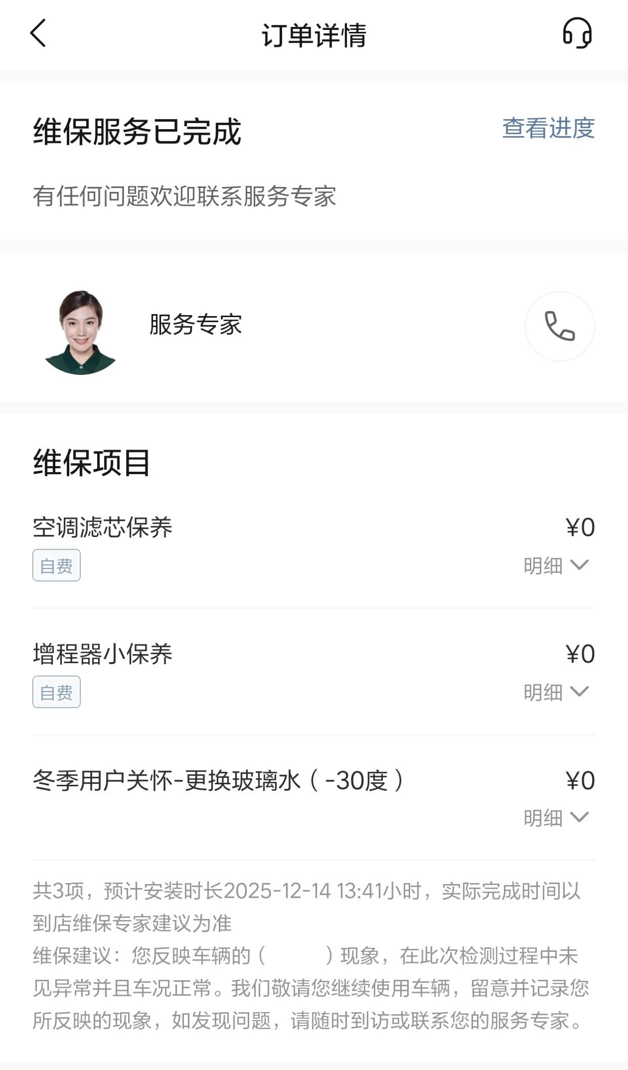 8. 完成与交付:技师完成所有项目后,会在PAD上提供一份详细的保养报告,说明已完成的保养内容及车辆状况,给到车主确认并签字,如果是现付的就会推送到APP上来付费,因为我用的是用车服务包中的保养,所以没有再自付。