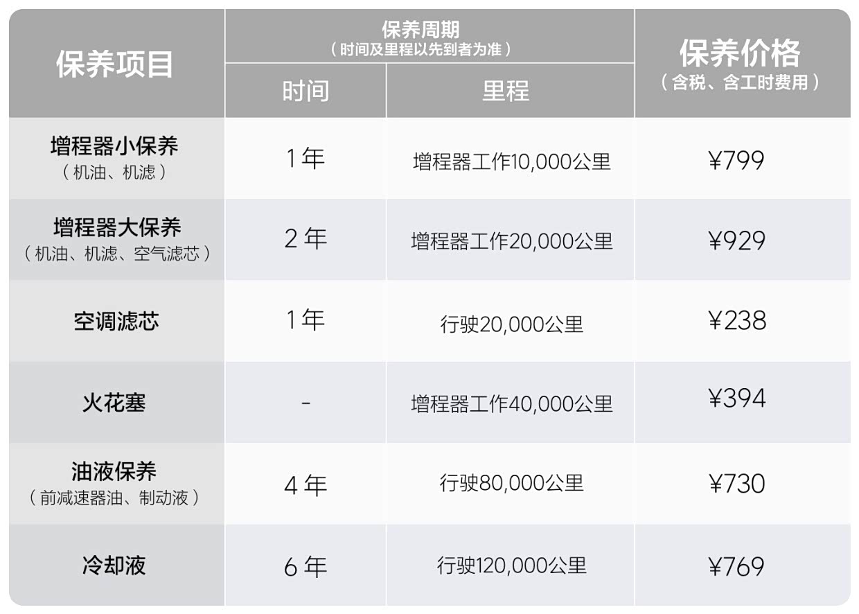 先简单介绍一下理想L系列的保养项目和保养周期以及价格,第1年或者增程器工作10000公里,那就是增程器小保养,第二年就是增程器大保养,多了一个空气滤芯,以下就是理想的保养表。