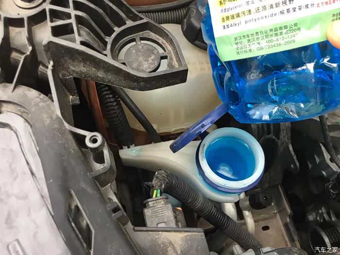 回到刚才说的过滤网,由于过滤网的存在,加水的时候没有那么爽快,容易漫出来,需要像倒啤酒一样稳住。看,这下装满了,估计可以用到元旦。我这瓶玻璃水有一个红色字体的“温馨提醒“友谊提示:北方地区请于每年1月1日前后更换防冻玻璃水。这说明两个问题啊,一是这一瓶不是防冻型的,另一个问题是元旦前后。东北是北方地区,现在是11月就已经结冰了,等不到1月1日。