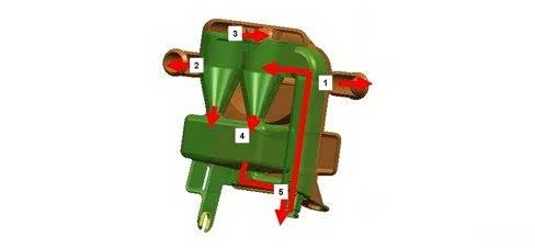 上图中,①部分负荷呼吸管(又称小回气管),连接至进气歧管;②全负荷呼吸管(又称大回气管),连接至主进气管靠近涡轮增压器进气口处;③流路切换膜片;④油气混合气分离锥;⑤气缸盖上收集到的曲轴箱窜气混合气入口;