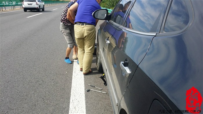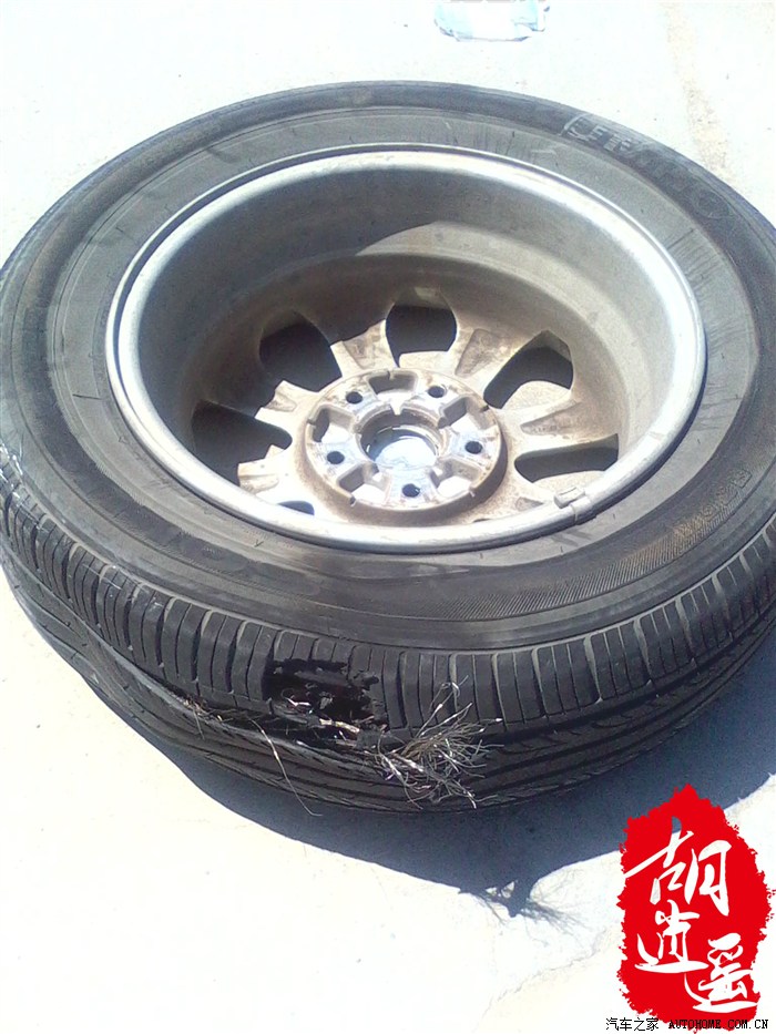 当天的太阳很足,又加上出了张家口之后,车少了,车速快了!当时就觉得有股烧焦的胶皮味道、司机就决定靠边查看一下。刚减速就感觉车子一下子矮了一大截,然后一行人下车,大家分工合作:一人摆警示牌,另两人查看后车驶来情况,剩下两人更换备胎。