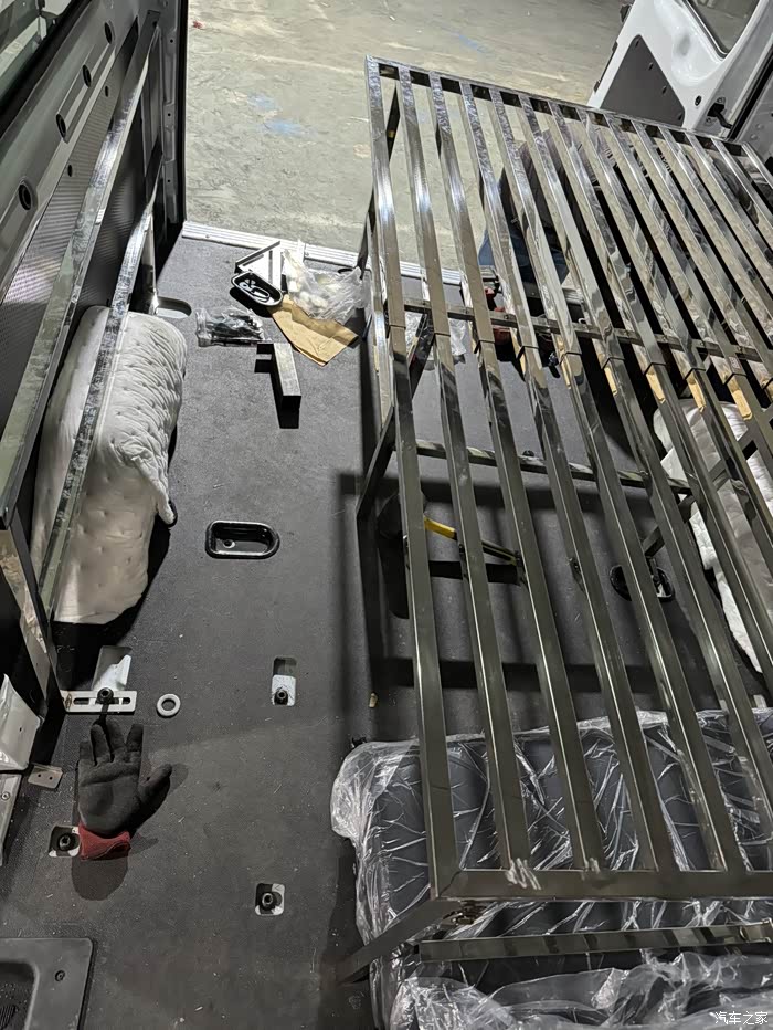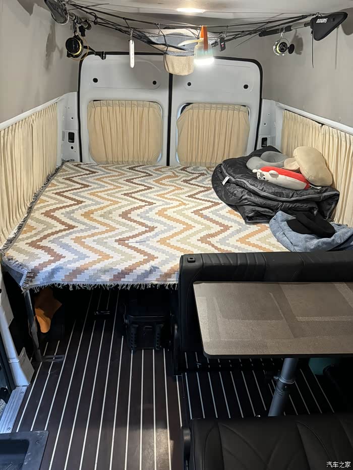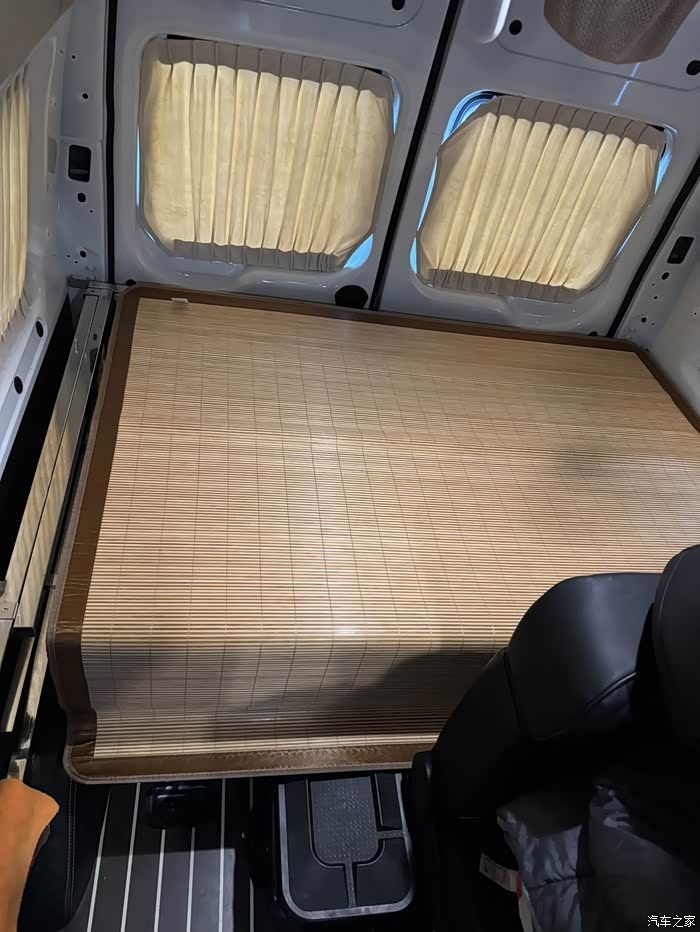 买回来自己用拉姆螺丝固定好就可以了而且很贴合。小桌板我用的是手动调节身高的这个很方便又不贵,下面本来以为要在车地板上打孔,后来想个方法,就是用家里装修时剩下的衣柜板材来固定,然后这个板材和座椅底框用螺丝固定好,就很稳当了,又不伤害原车底盘,然后再用塑胶地板,剩下的料来装饰一下就可以了!后床我买了一张凉席,这样就很好的照顾了床的伸缩功,