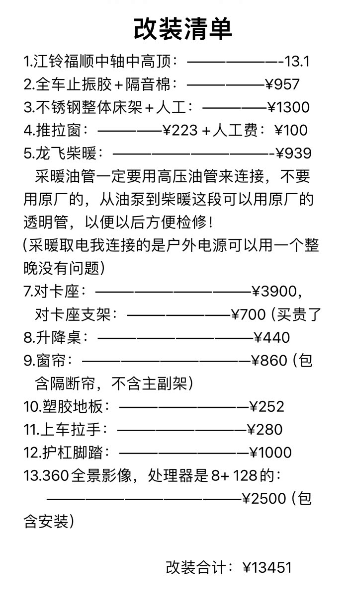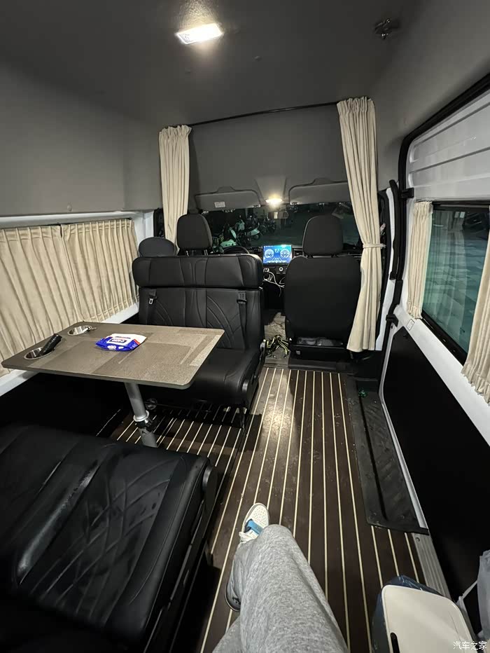后面我会覆上改装清单。下面这个是我2020年改的一辆新全顺短轴低顶的,当时由于车内空间太小站不起来也没有我喜欢的对卡座就卖掉了。