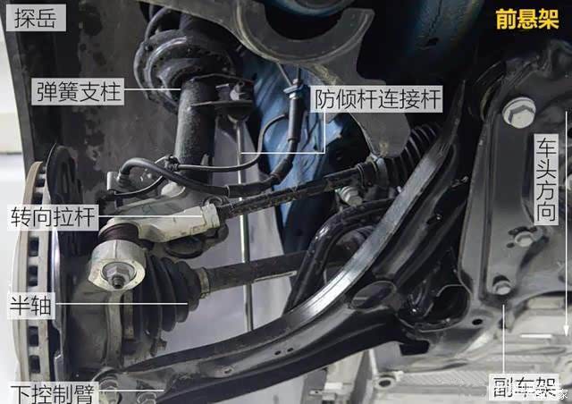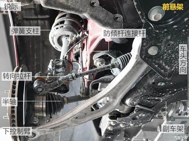 探岳的底盘结构有着明显的"MQB"风格,前麦弗逊式悬架在控制臂造型、防倾杆设计以及零部件用料等方面,与大众MQB平台的很多车型都类似。锐际和现款翼虎一样采用麦弗逊式前悬架,但下控制臂的铰接方式和材质都有变化,也说明了新平台下的锐际对悬进行了重新设计。