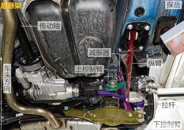 锐际同样采用"三横一纵"的控制臂设计,大致结构与探岳并没差太多,剩下只是一些细节差异,比如材料。锐际的后悬架中下控制臂明显为铝合金材质。