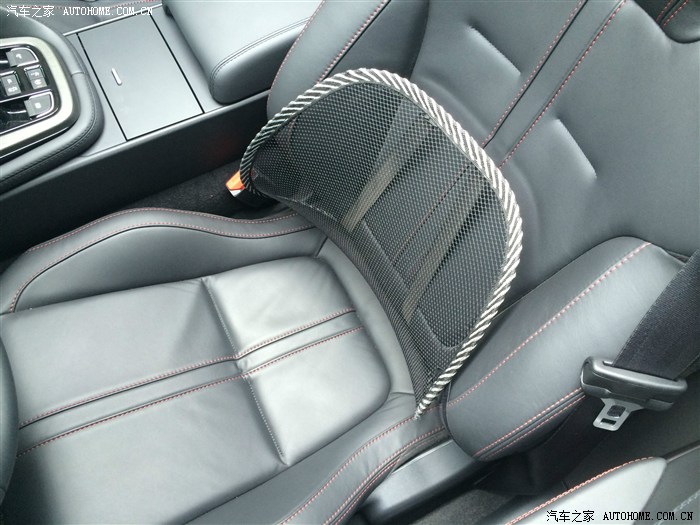 c. 运动座椅: 运动座椅的造型和其他牌子的差不多,比标配的座椅要好看,黑色真皮配红色缝线真的很好看,而且我感觉捷豹缝线的做工做的确实很好。缺点就是桶型座椅腰部那里是陷下去的,时间久了腰会很酸。4S店送了两个腰部支撑的网兜(后面的图里面会有),用上了舒服了很多,真心是长途神器啊。