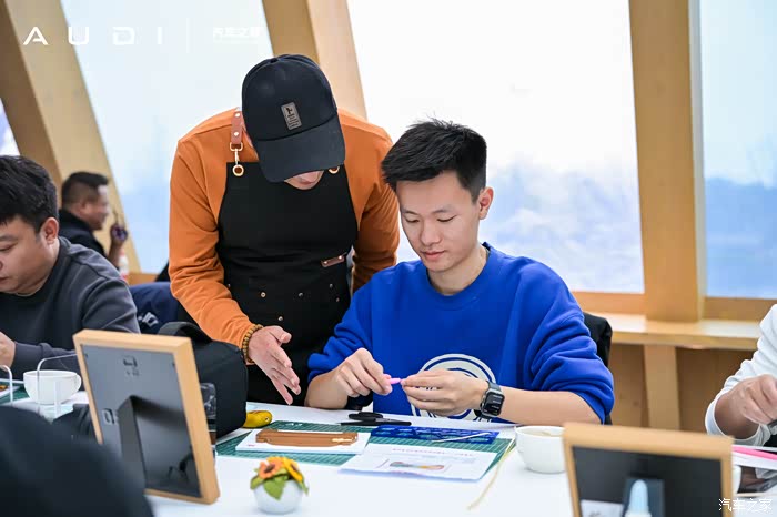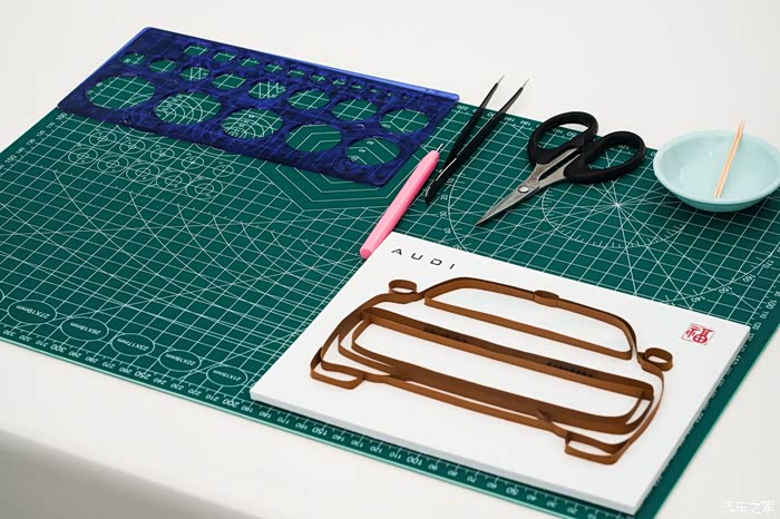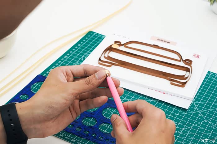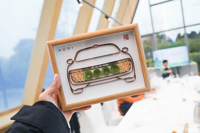 静态体验完之后,接下来就是分组的动态试驾环节了。主办方为了让我们都能充分对比体验到5款车型的驾控,一共分了两组试驾,每组分别体验一个半小时左右,所以当前一组在试驾时我们便在棚房内感受卷纸艺术(又称衍纸装饰工艺),这是一种以细长纸条卷曲成基础零件后组合造型的纸艺技法,通过卷、捏、拼、贴等手法实现立体装饰效果,兼具绘画色彩表现力与雕塑空间视觉特征