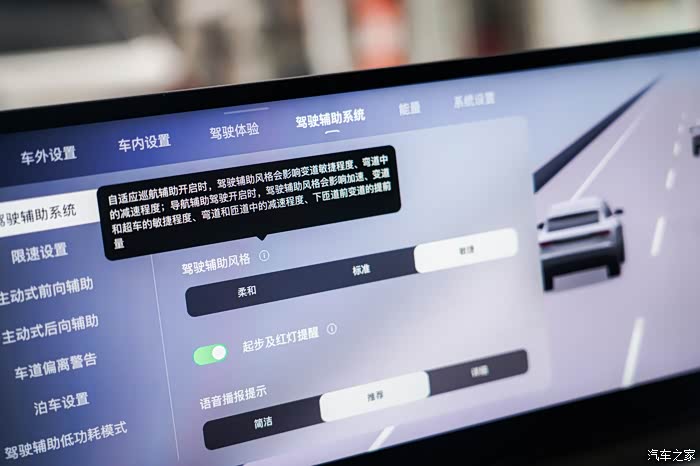 辅助驾驶的能力也是我比较关注的一点,奥迪E5 Sportback搭载英伟达Orin-X芯片,配备1颗激光雷达,采用Momenta的辅助驾驶方案。与其他品牌不同的是该方案是由奥迪与Momenta两家公司联手打造,因为奥迪希望在使用辅助驾驶的过程中依旧具备驾驶乐趣,所以可以看到在驾驶辅助风格上有“柔和、标准、敏捷”三种模式,调整到“敏捷”模式后整个驾驶辅助的动作就会更激进一点,能够体现出德系车的驾驶风格,这点还挺有意思的