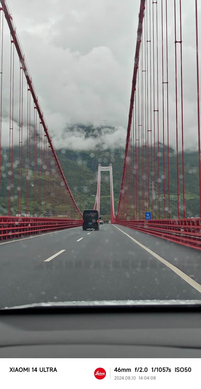 细雨,淅淅沥沥的落在挡风玻璃上,懒得刮了。金沙江大桥,落差很大,峡谷很深。