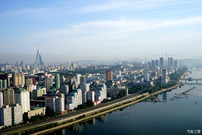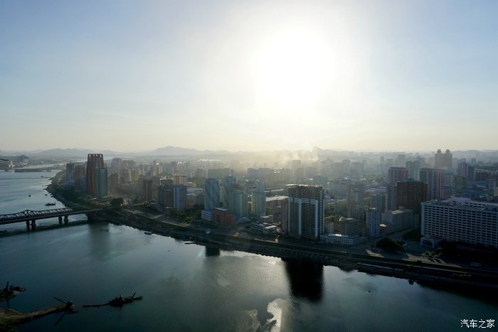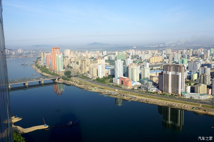 从电梯旁边的窗户看另一侧的大同江支流与市区